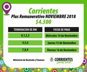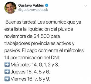 El gobernador Gustavo Valdés anunció hoy, a través de su cuenta de twitter (@gustavovaldesok), el inicio del pago del plusremunerativo de $4.500 correspondiente a noviembre y confirmó que se abonará a partir del miércoles 14 y en tres días.