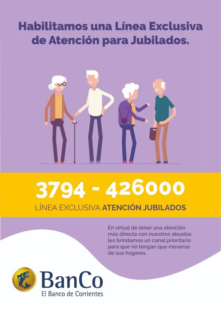 En virtud de una atención más directa hacia los adultos mayores, el Banco de Corrientes habilitó una línea telefónica para exclusiva asistencia de jubilados. El número en cuestión es 3794-426000 y busca evitar que los usuarios se muevan de sus hogares.