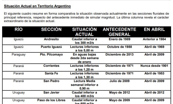 El resumen señala baja probabilidad de lluvias significativas sobre las cuencas de principal interés. Así también se indica que “la tendencia climática plantea, como siempre en los últimos años, un margen de incertidumbre, en especial en lo que respecta a la permanencia o persistencia de la actual condición de aguas bajas e inclusive de un eventual agravamiento por escasez de lluvias”.