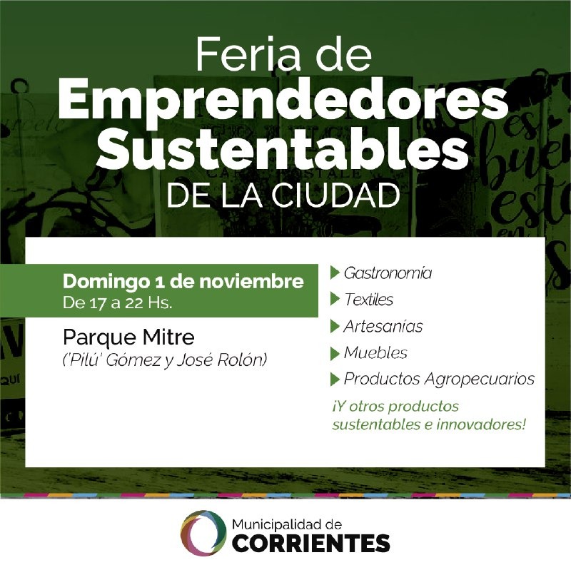 En el marco de las Ferias de la Ciudad que cada semana desarrolla la Municipalidad de Corrientes por diferentes barrios, este domingo 1 de noviembre se desarrollará la Feria de Emprendedores Sustentables de la Ciudad. De 17 a 22 en el parque Mitre se desarrollará este espacio de comercialización con el objetivo de visibilizar, promover y fortalecer al sector, generando oportunidades de comercialización y consumo responsable.