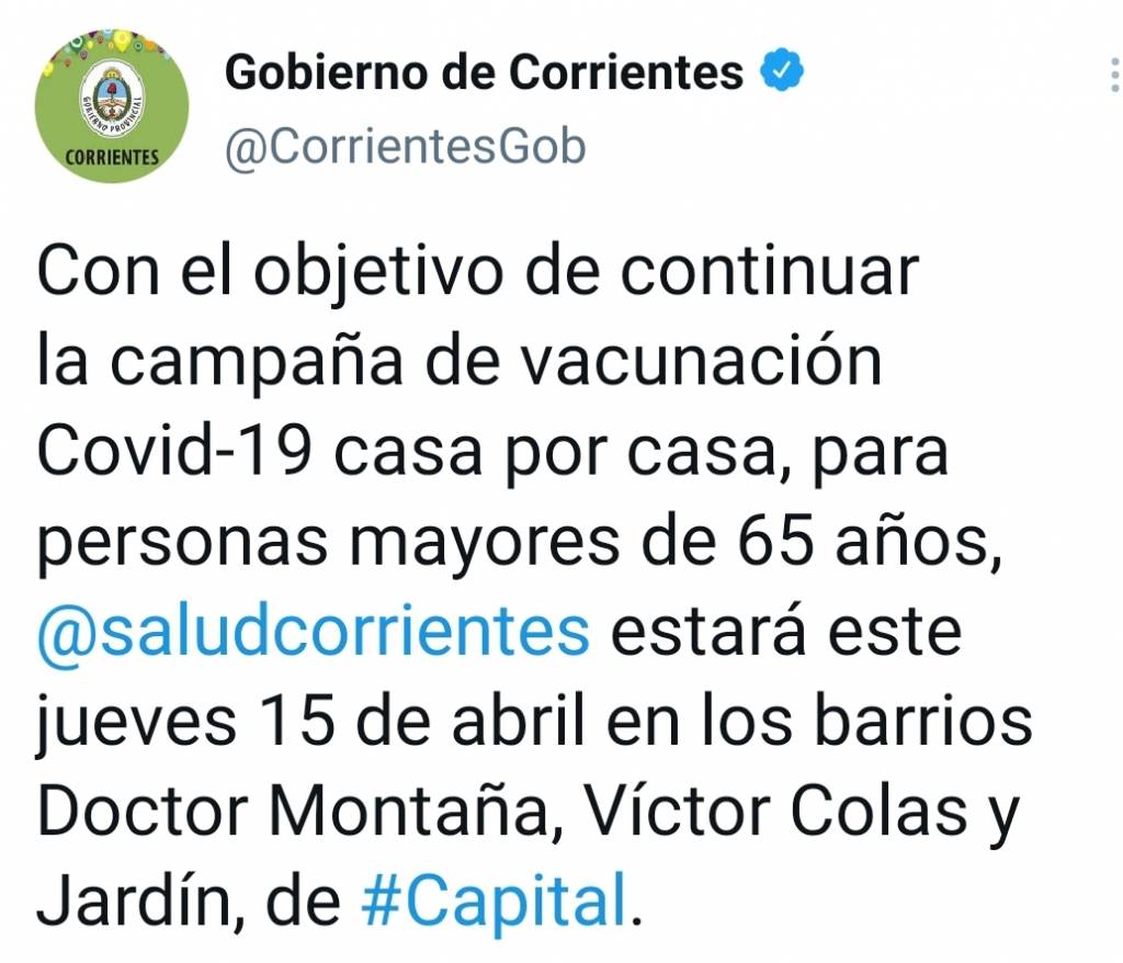 El Gobierno de Corrientes informó que con el objetivo de continuar la campaña de vacunación Covid-19 casa por casa, para personas mayores de 65 años, el Ministerio de Salud Pública estará este jueves 15 de abril en los barrios Doctor Montaña, Víctor Colas y Jardín, de Capital.