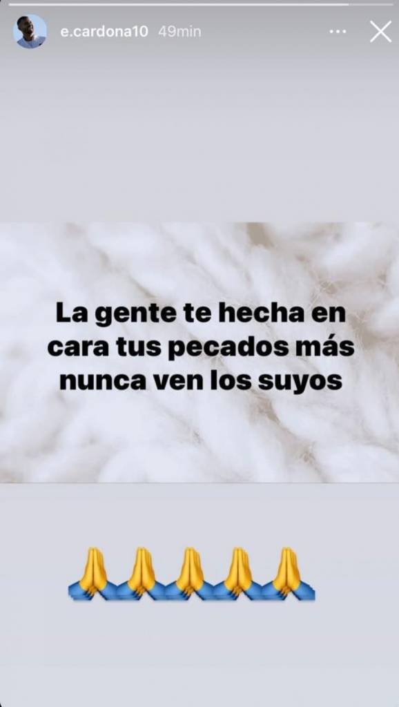 “La gente te echa en cara tus pecados más nunca ven los suyos”, escribió Cardona en un mensaje que compartió en su cuenta de Instagram, acompañado del emoji de las palmas de las manos juntas, como si pidiera perdón. Antes, en el inicio de la práctica del plantel de Boca, el colombiano pidió la palabra frente a todos los jugadores y se disculpó por su definición frente a sus compañeros, a quienes les agradeció la clasificación. Pero el tema no terminó ahí: porque Miguel Russo le reconoció el gesto del pedido de disculpas adelante de todos pero lo retó, diciéndole que en este tipo de definición no debe picarla.