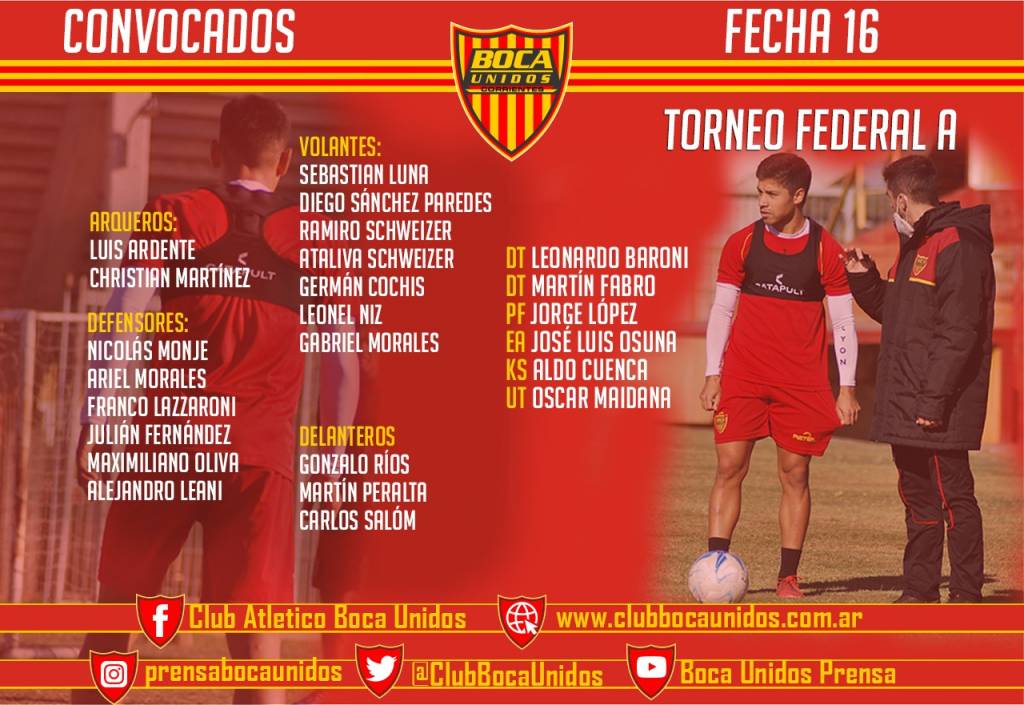 Boca Unidos: Luis Ardente; Nicolás Monje, Julián Fernández, Franco Lazzaroni y Maximiliano Oliva; Sebastián Luna, Diego Sánchez Paredes y Ramiro Schweizer; Gabriel Morales; Gonzalo Ríos y Carlos Salom. DT: Leonardo Baroni y Martín Fabro.