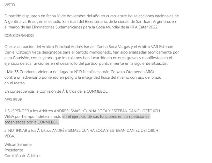 Asimismo, esta mañana se dio a conocer desde el ente regulador del fútbol sudamericano la decisión que se tomó con Andrés Cunha y con Esteban Ostojich, quien era el encargado de manejar el Videoarbitraje en el clásico sudamericano. La casa madre del fútbol de Sudamérica resolvió suspender a ambos colegiados “por tiempo indeterminado en el ejercicio de sus funciones en competiciones organizadas por la CONMEBOL”, por que “han incurrido en errores graves y manifiestos en el ejercicio de sus funciones en el desarrollo del partido…”.