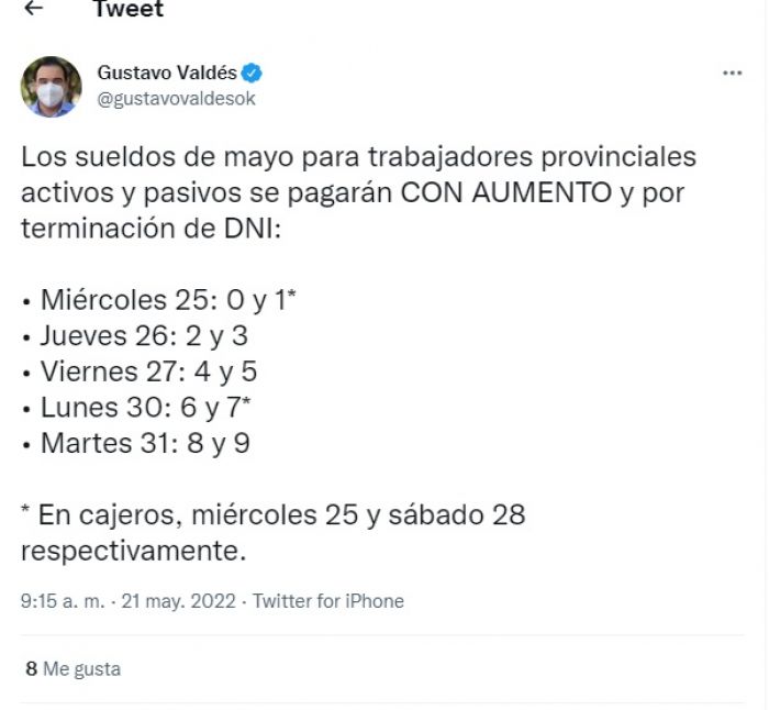 El gobernador de la provincia Gustavo Valdés anunció que el próximo miércoles 25 de mayo arranca el pago de sueldos a los trabajadores de la administración pública.