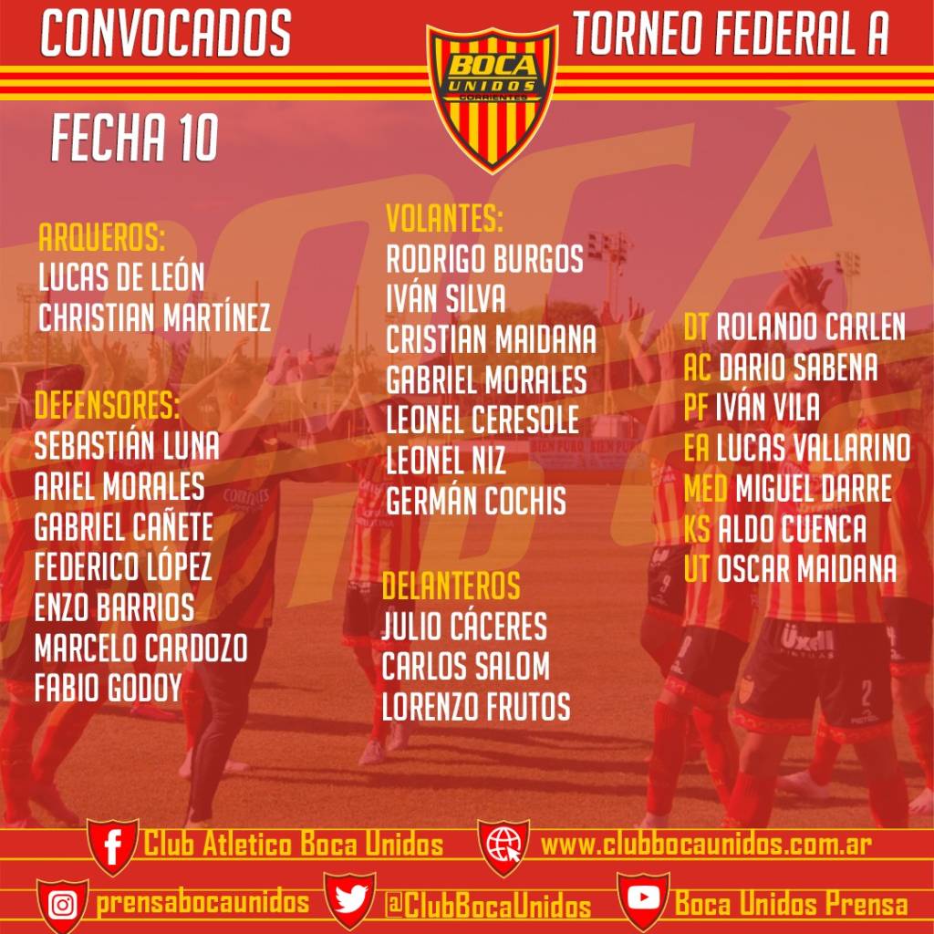 Entonces, Boca Unidos alistará a Lucas De León; Luna, Ariel Morales, Gabriel Cañete y Federico López; Silva, Burgos y Cristian Maidana; Carlos Salom, Julio Cáceres y Gabriel Morales. Además, el resto de los convocados son Christian Martínez, Marcelo Cardozo, Enzo Barrios, Godoy, Leonel Ceresole, Leonel Niz, Germán Cochis y Lorenzo Frutos.