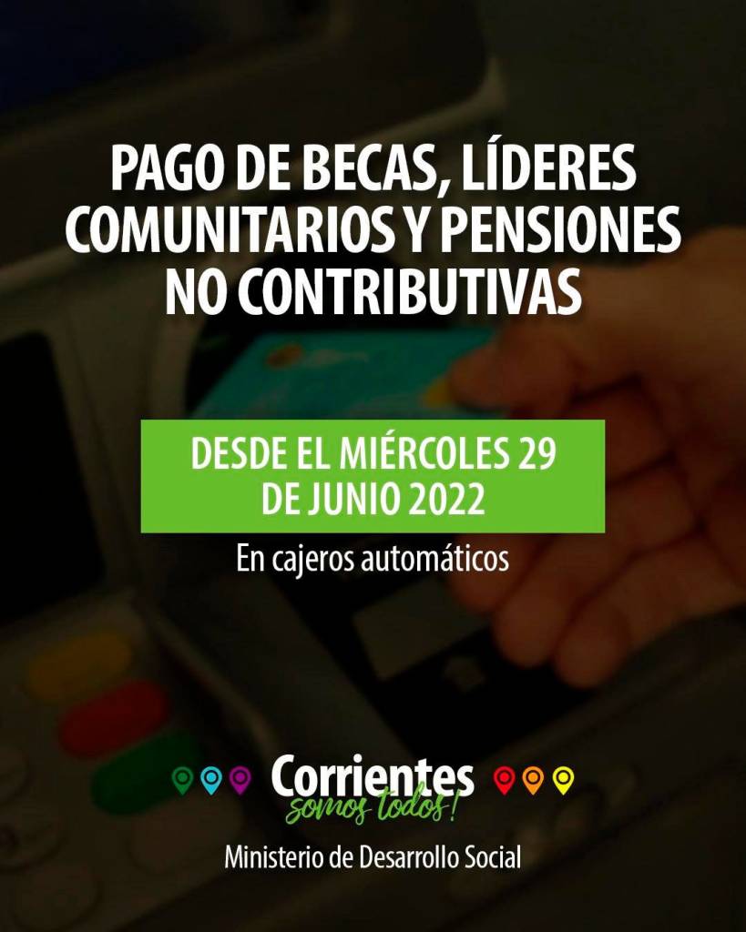 El Ministerio de Desarrollo Social de la provincia, informa a beneficiarios, que desde este miércoles 29 de junio de 2022, estará disponible el pago de BECAS, Pensiones No Contributivas y Líderes Comunitarios dependientes de este organismo.