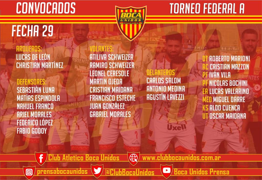 Entonces, Boca Unidos visitará a Depro con Lucas De León; Sebastián Luna, Matías Espíndola, Nahuel Franco y Federico López; Martín Ojeda, Ataliva Schweizer, Ramiro Schweizer y Leonel Ceresole; Carlos Salom y Agustín Lavezzi. El equipo viaja esta noche para afrontar el duelo del domingo a las 11, que contará con el arbitraje del cordobés Matías Billione Carpio.