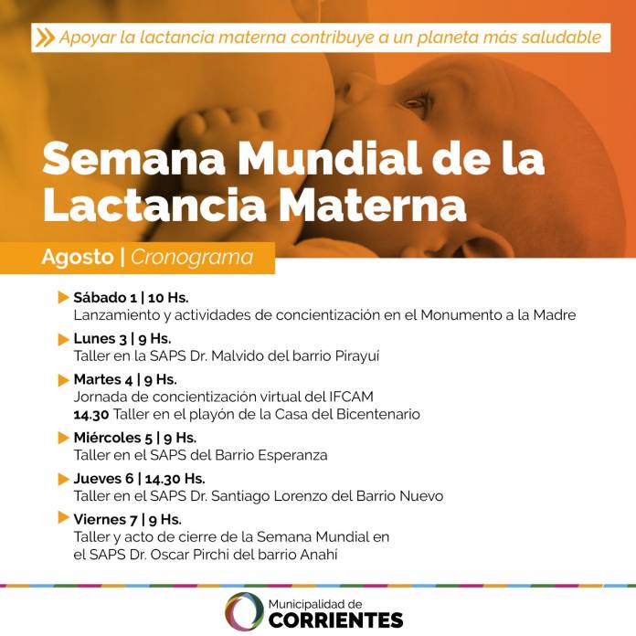 El lanzamiento será el sábado 1 de agosto a las 10 en el monumento a la Madre ubicado en el puerto local, donde se entregará folletería y el moño dorado, símbolo de la lactancia materna. Del 3 al 7 habrá en los SAPS talleres de Preparación Integral para la Maternidad y Desarrollo Infantil Temprano, mientras que durante todo el mes habrá jornadas de concientización organizadas por el IFCAM y otros talleres alusivos.