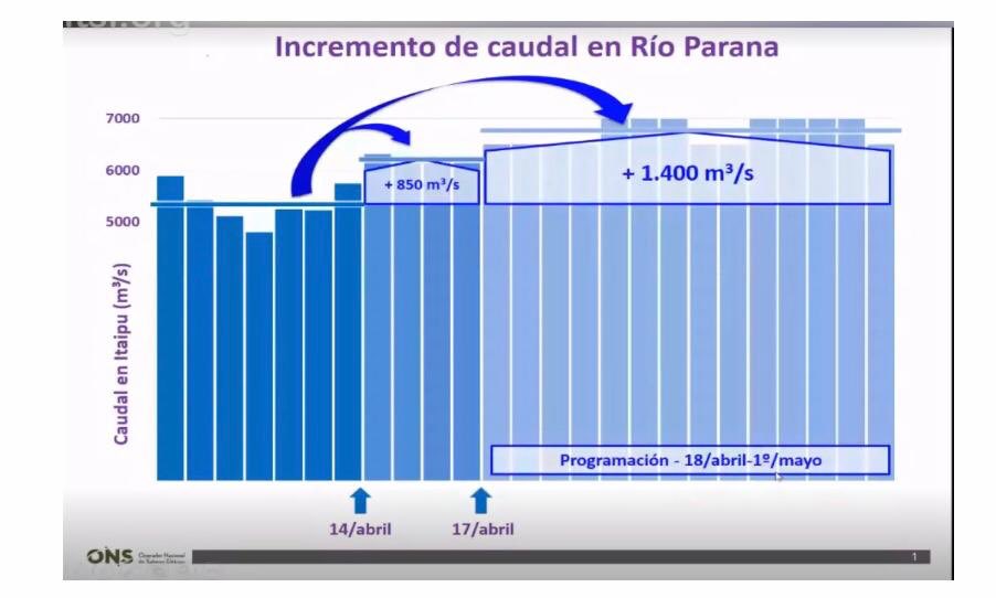 Adicionalmente se convino que a partir del 18 de abril y hasta el 1 de mayo se aumentarán nuevamente las erogaciones en 550 metros cúbicos por segundo, para que el incremento total sea de 1.400 metros cúbicos por segundo y el caudal ascienda hasta los 6.750 metros cúbicos por segundo.