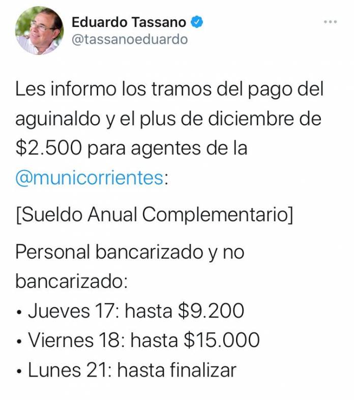 Este jueves 17 de diciembre, la Municipalidad de Corrientes comenzará a pagar el Sueldo Anual Complementario (SAC) junto con el plus de 2.500 pesos del mes de diciembre para todo el personal, según informó el intendente Eduardo Tassano a través de su cuenta oficial de Twitter.