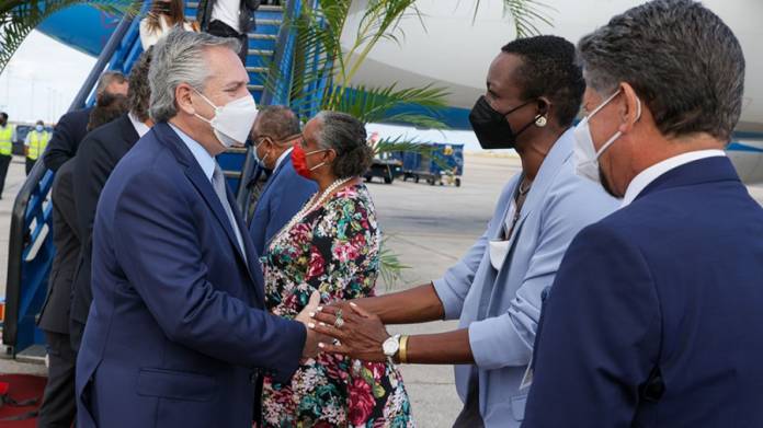 El presidente Fernández llegó con su comitiva a Bridgetown, capital de Barbados, poco después de las 16 (hora de la Argentina), informaron fuentes oficiales.