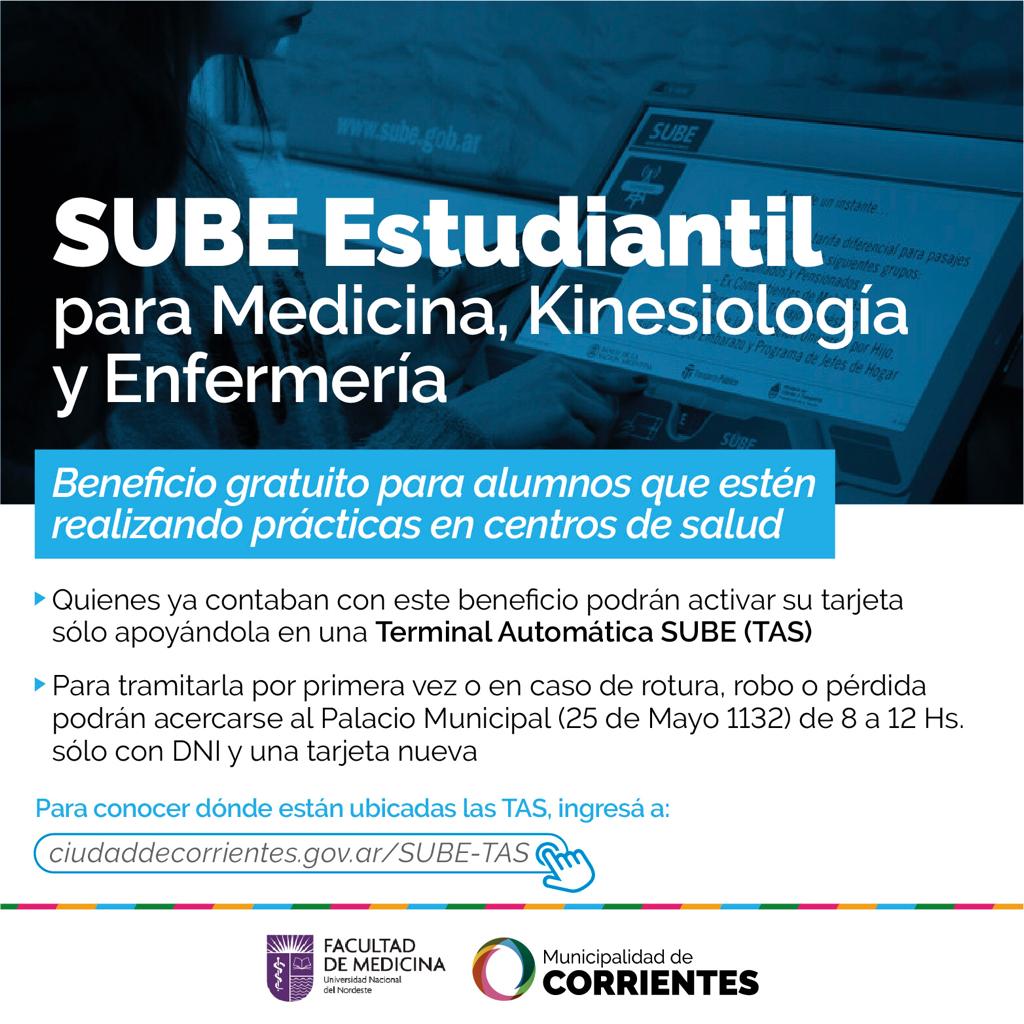 La Municipalidad de Corrientes informa que a partir de hoy está habilitado el servicio de SUBE Estudiantil a los alumnos de las carreras de Medicina, Enfermería y Kinesiología que estén realizando sus prácticas en diferentes centros de salud.