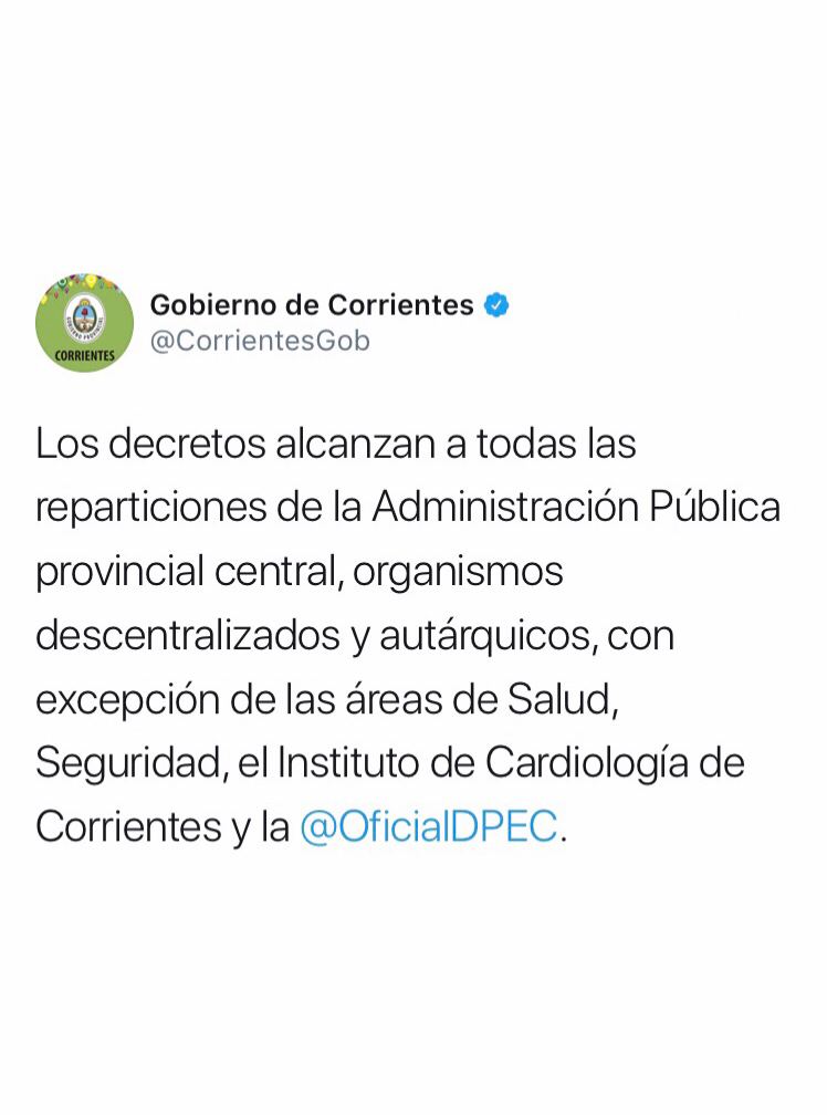 Cabe recordar que los decretos alcanzan a todas las reparticiones de la Administración Pública provincial central, organismos descentralizados y autárquicos, con excepción de las áreas de Salud, Seguridad, el Instituto de Cardiología de Corrientes y la DPEC.