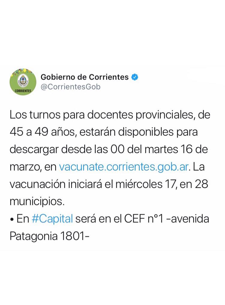 El Gobierno de Corrientes comunicó por medio de su cuenta oficial Twitter (@CorrientesGob) que a partir de las 00 de este martes 16, estarán disponibles para descargar los nuevos turnos de vacunación para docentes provinciales de 45 a 49 años. La vacunación comenzará a partir del miércoles 17 de marzo, en 28 municipios de la provincia.