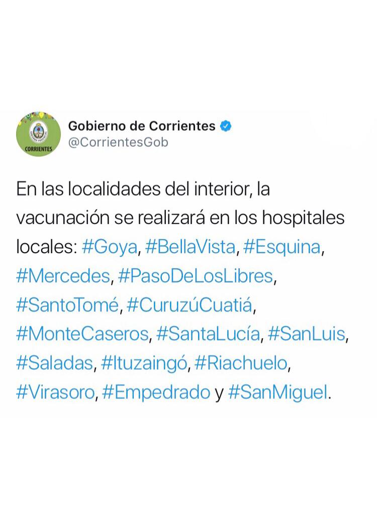En las localidades del interior, los vacunatorios se realizarán en los hospitales de: Goya, Bella Vista, Esquina, Mercedes, Paso de los Libres, Santo Tomé, Curuzú Cuatiá, Monte Caseros, Santa Lucía, San Luis del Palmar, Saladas, Ituzaingó, Riachuelo, Virasoro, Empedrado, San Miguel, Mburucuyá, Paso de la Patria, Alvear, Santa Ana, Perugorría, Itatí, La Cruz, Sauce, Itá Ibaté, Mocoretá y Caá Catí.