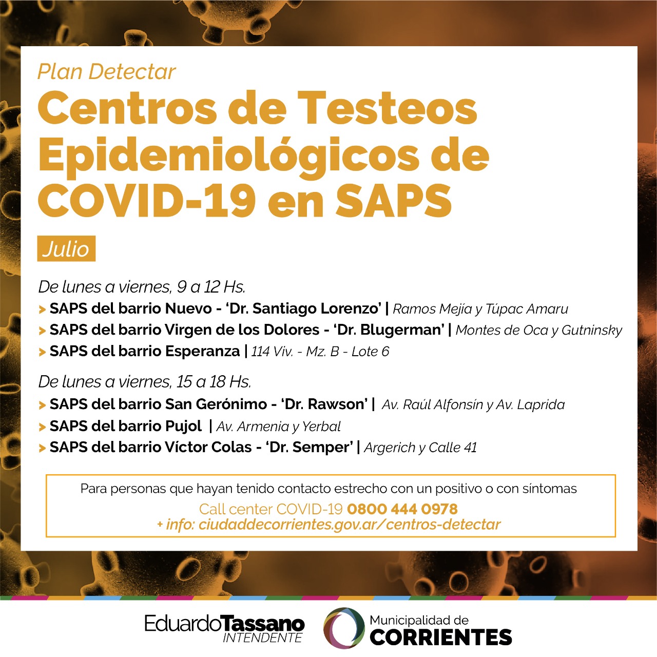 La Municipalidad de Corrientes dio a conocer cuáles serán las Salas de Atención Primaria de la Salud que, a partir del jueves 1 de julio, y durante todo ese mes, realizarán las pruebas de Covid-19.