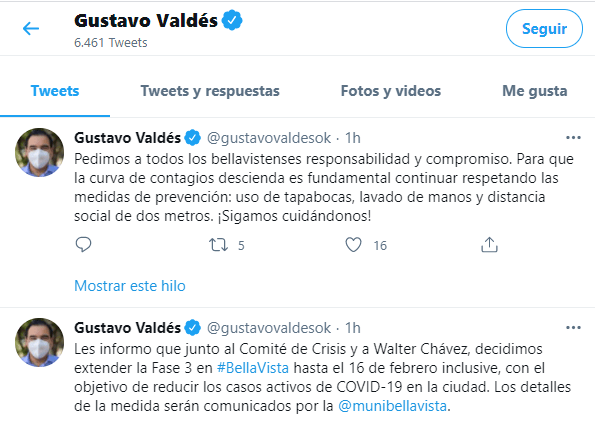 “Les informo que junto al Comité de Crisis y a (intendente) Walter Chávez, decidimos extender la Fase 3 en Bella Vista hasta el 16 de febrero inclusive, con el objetivo de reducir los casos activos de COVID-19 en la ciudad”, anunció el mandatario, a través de su cuenta de Twitter.
