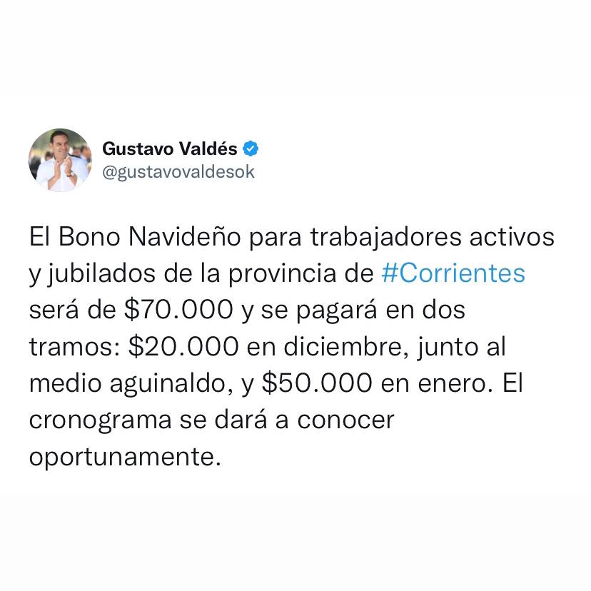 Este martes el gobernador Gustavo Valdés anunció ante la prensa que el bono navideño para los trabajadores provinciales activos y pasivos será de 70.000 pesos. El mismo se pagará en dos tramos –$20.000 en diciembre junto al aguinaldo y los $50.000 restantes en enero- y alcanzará a activos y pasivos.