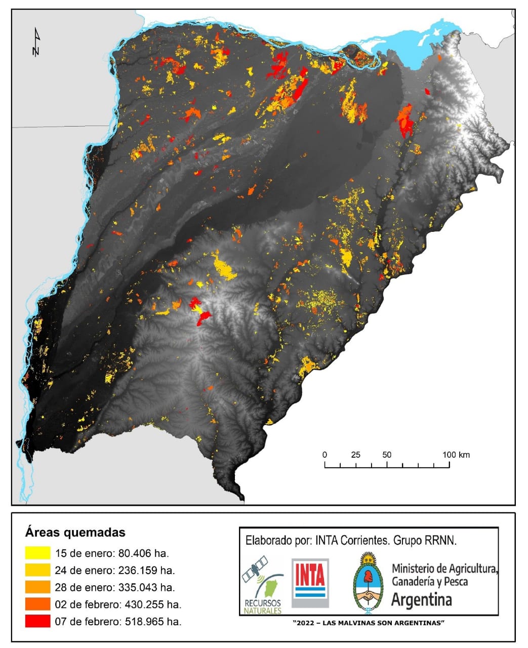 El Grupo de Recursos Naturales de la EEA Corrientes, presentó esta tarde un Informe actualizado de las áreas afectas por el fuego en la Provincia de Corrientes, según la cobertura vegetal afectada.
