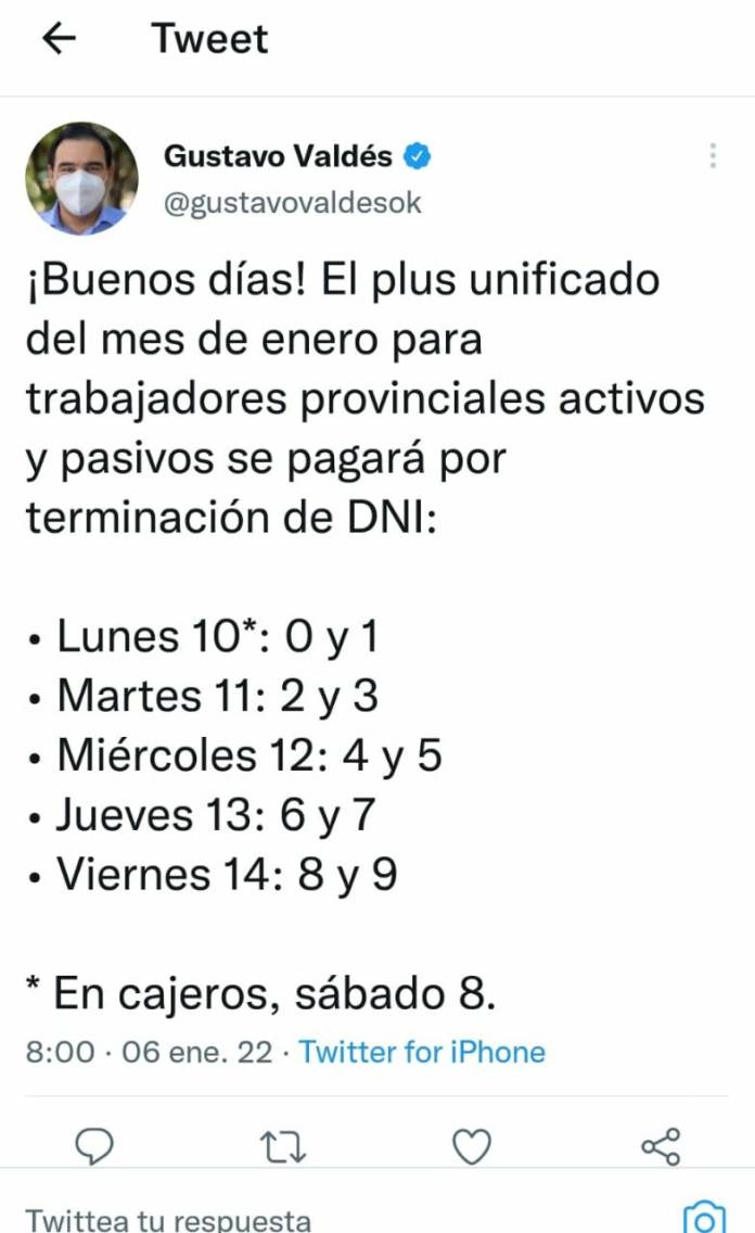 El gobernador Gustavo Valdés informó este jueves desde sus redes sociales que el plus unificado del mes de enero para trabajadores provinciales activos y pasivos se pagará por terminación de DNI, de acuerdo al siguiente cronograma: