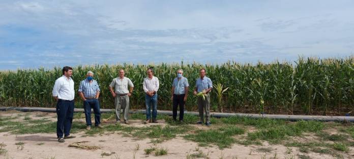 Jetter, gerente general de Copra S.A, detalló al ministro Anselmo el proceso que vienen desarrollando y perfeccionando desde hace cuatro años para el cultivo bajo riego de maíz utilizando el agua de sus represas. Además, los canales de la arrocera han sistematizado con surcos, lotes de 700 metros de ancho, aportando agua con mangas y un sistema de compuertas que les permite regular el caudal.
