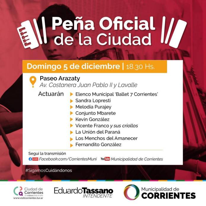Como cada fin de semana, la Peña Oficial de la Ciudad ofrecerá espectáculos gratuitos en vivo de destacados artistas chamameceros. La cita será este domingo, desde las 18.30, en el Paseo Arazaty. Este domingo a partir de las 18.30, el Paseo Arazaty (avenida costanera General San Martín y avenida 3 de Abril) será el espacio donde se desarrollará una nueva edición de la Peña Oficial de la Ciudad. Nuevos talentos y artistas consagrados de la música chamamecera actuarán en un espectáculo gratuito a puro sapucay. Quienes deseen disfrutar del show desde la comodidad de sus hogares, también podrán seguir la transmisión en vivo a través de las redes sociales oficiales: Facebook (https://www.facebook.com/corrientesmuni/) o por el canal de YouTube Municipalidad de Corrientes Oficial. En esta edición, actuarán: el Elenco Municipal Ballet 7 Corrientes, Sandra Lopresti, Melodía Purajey, conjunto Mbareté, Kevin González, Vicente Franco y sus criollos, La Unión del Paraná, Agustín Borda y Los menchos del amanecer. “Como es característico, la Peña Oficial de la Ciudad brinda un escenario para los nuevos artistas, no sólo para que tengan la posibilidad aquellos que recién empiezan a experimentar cómo es tocar en un lugar importante, con mucho público, sino también brindarle un buen sonido y un trato de un artista profesional”, destacó el director General de Expresiones Musicales Populares del municipio, Raúl Báez. En esta oportunidad, “el público disfrutará de la actuación de quienes por primera vez subirán a este escenario como Sandra Lopresti, conjunto Mbareté, Melodía Purajey y Kevin González; además desde el Chaco llegarán Los menchos del amanecer, también la actuación del ballet 7 Corrientes y culminará la jornada a pura bailanta chamamecera de la mano de La Unión del Paraná y Vicente Franco y sus criollos”, anticipó el funcionario. |