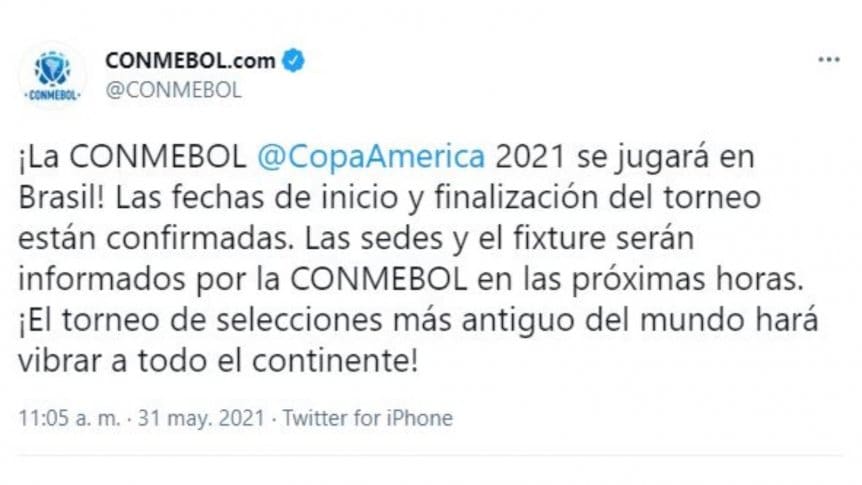 El anuncio lo realizó Conmebol a través de sus redes oficiales a las 11.05: “¡La Copa América 2021 se jugará en Brasil! Las fechas de inicio y finalización del torneo están confirmadas. Las sedes y el fixture serán informados por la CONMEBOL en las próximas horas. ¡El torneo de selecciones más antiguo del mundo hará vibrar a todo el continente!”, informó en Twitter.