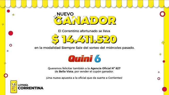 En el último sorteo de la modalidad Siempre Sale del Quini 6, realizado el pasado miércoles, un afortunado correntino de la localidad de Bella Vista se llevó $14.411.520.