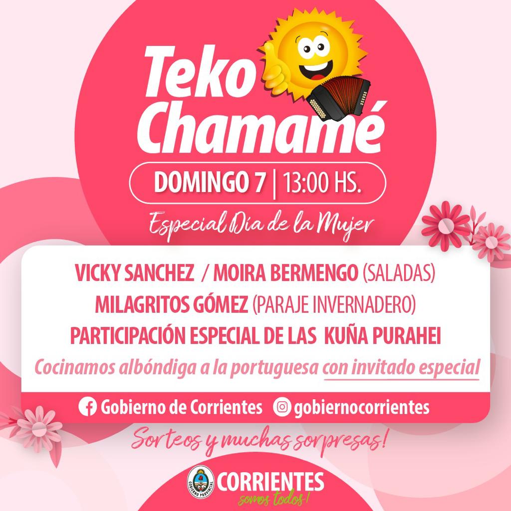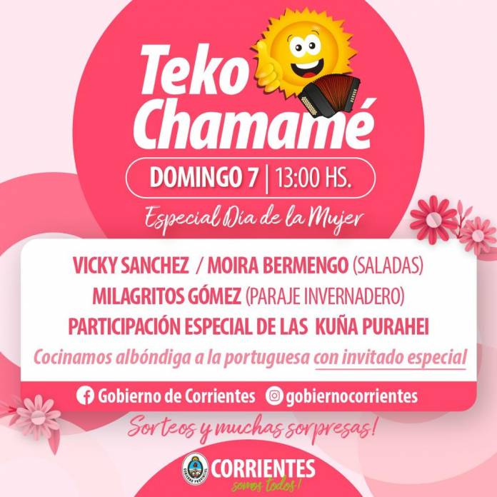 En tanto que el domingo 07 a partir de las 13 se propone el Especial del Día de la Mujere Teko Chamamé que contará con la presencia de “Vicky Sanchez/Moira Bermengo (Saladas); Milagritos Gòmez (Paraje Invernadero) y participación especial de las Kuña Purahei.