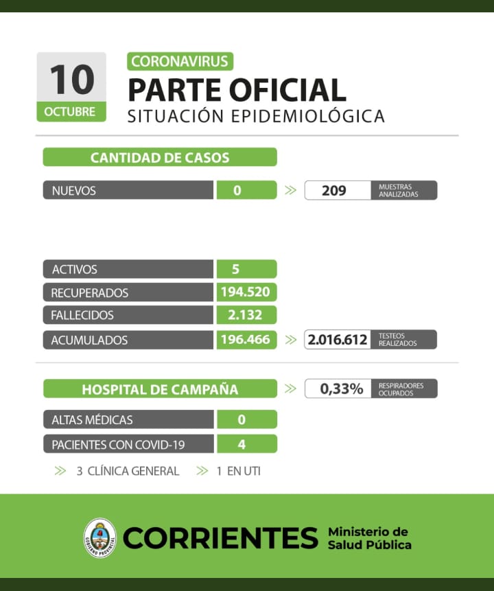 El informe epidemiológico de este lunes 10 de octubre de la provincia de Corrientes, indicó que, no se registraron nuevos casos positivos de Coronavirus, tanto en Capital como en el Interior, al haberse analizado 209 muestras en las últimas 24 horas.