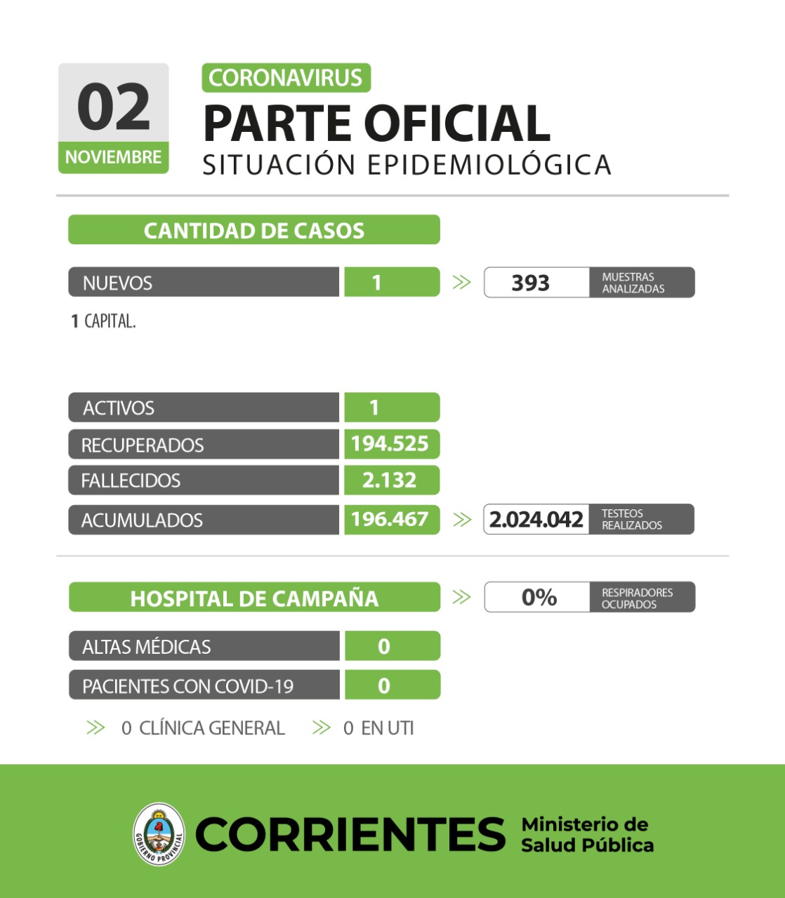Esto mantiene la cifra de casos activos en 1 y los acumulados en 196.467 en todo el territorio provincial al 2 de noviembre de 2022, con 2.024.042 testeos realizados desde que inició la pandemia y 194.525 recuperados.