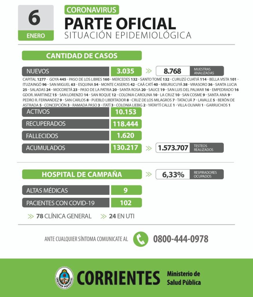 El informe epidemiológico de la provincia de Corrientes registró este jueves 3.035 nuevos casos positivos de Coronavirus, de los cuales 1.277 fueron contagios en la ciudad Capital y los 1.758 restantes en 42 localidades del interior provincial, al haberse analizado 8.768 muestras.
