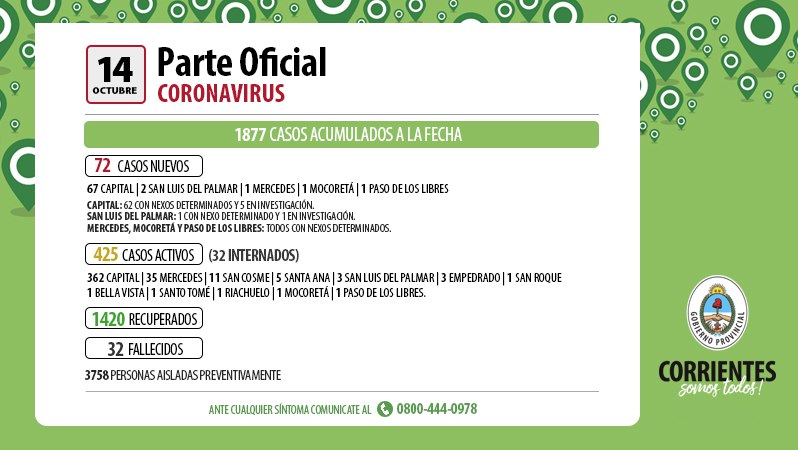 Se encuentran activos 425 positivos, de los cuales 32 se encuentran internados en el hospital de Campaña, en condición clínica estable. De los activos positivos 362 corresponden a Capital, 3 San Luis del Palmar, 1 de Bella Vista, Mercedes 35, San Cosme 11, 3 de Empedrado, 5 de Santa Ana, 1 de Santo Tome, 1 de Riachuelo, 1 de Paso de los Libres, 1 de San Roque y 1 de Mocoretá.