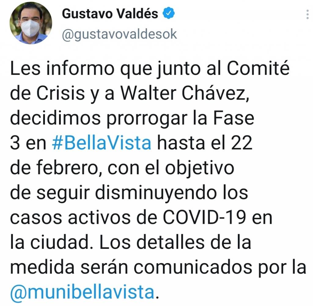 Gustavo Valdés informó por medio de su cuenta de Twitter, que la ciudad de Bella Vista seguirá en Fase 3, debido a la situación epidemiológica que aún atraviesa la comuna, como consecuencia de los casos activos de Covid-19.