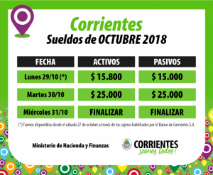 Los haberes se liquidarán desde el lunes 29, a activos hasta $15.800, y jubilados hasta $15.000; tramo que estará disponible a través de los cajeros automáticos habilitados por el Banco de Corrientes S.A. desde el sábado 27.