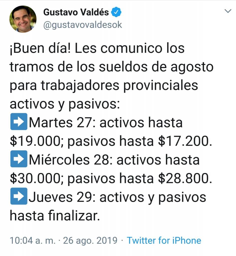 El gobernador Gustavo Valdés confirmó este lunes a través de su cuenta de Twitter, los tramos para el pago de los sueldos de la Administración pública correspondientes a agosto. Iniciará este martes 27 para activos hasta 19 mil pesos y pasivos hasta $17.200; continuará el miércoles 28 para trabajadores activos que perciban hasta 30 mil y jubilados hasta $28.800; y el jueves 29 de agosto hasta finalizar.