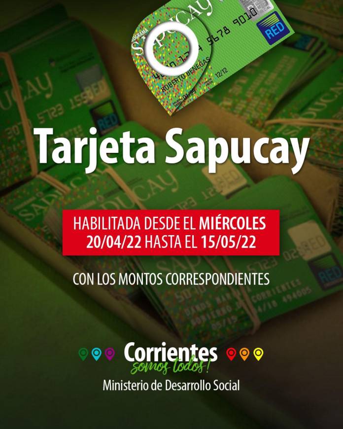 El Ministerio de Desarrollo Social de la Provincia informa a los beneficiarios que las Tarjetas Sapucay desde este miércoles, estarán habilitadas hasta el 15 de mayo 2022.