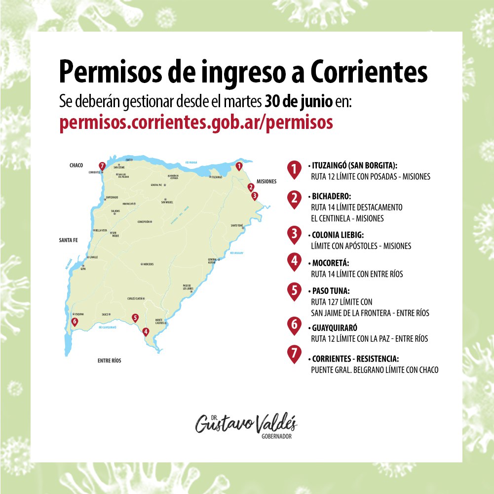 Tal como anunció el gobernador Valdés en conferencia de prensa, desde este martes 30 de junio están habilitados para su solicitud los permisos de ingreso a la provincia de Corrientes. Los mismos son obligatorios e independientes del permiso de circulación nacional.