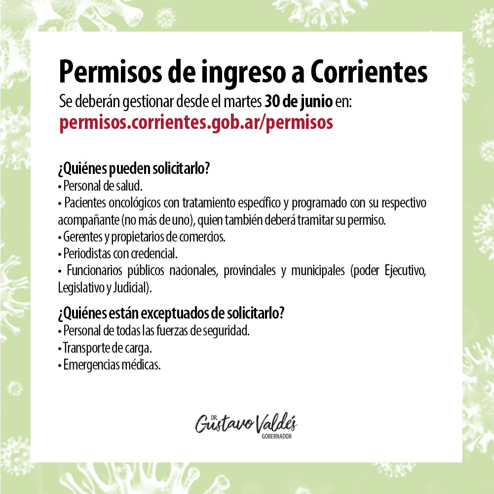 La gestión deberá realizarse en el sitio www.permisos.corrientes.gob.ar/permisos y está dirigida a personal de salud, pacientes oncológicos con tratamiento específico (con un acompañante que deberá tramitar su permiso también), gerentes y propietarios de comercios, periodistas con credencial y funcionarios nacionales, provinciales y municipales. Las fuerzas de seguridad, el transporte de carga y las emergencias médicas están exceptuadas del permiso.