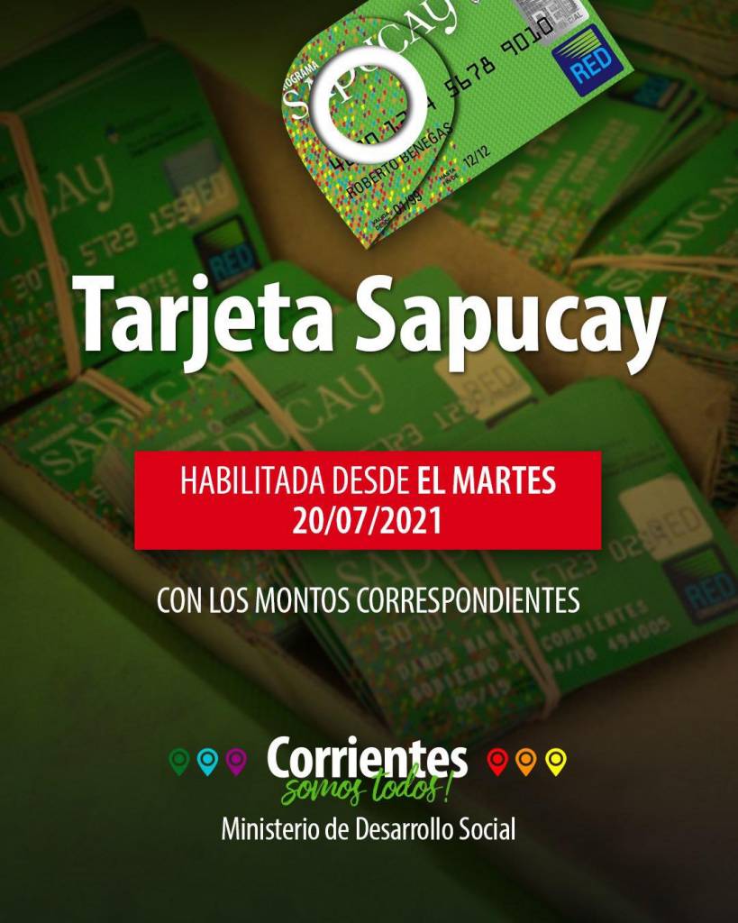 El Ministerio de Desarrollo Social del Gobierno de Corrientes, a cargo de Adán Gaya informa a los beneficiarios del Programa que las Tarjetas Sapucay desde este martes 20 de julio estarán habilitadas hasta el 7 de agosto.