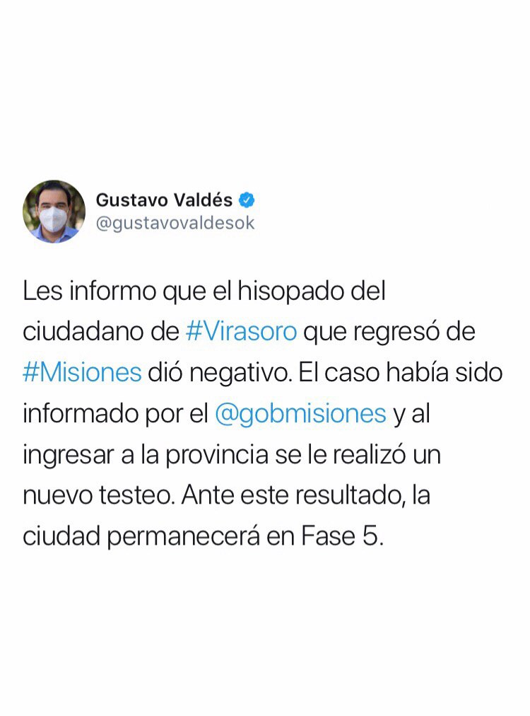 “Les informo que el hisopado del ciudadano de Virasoro que regresó de Misiones dio negativo. El caso había sido informado por el gobierno de Misiones y al ingresar a la provincia se le realizó un nuevo testeo. Ante este resultado, la ciudad permanecerá en Fase 5”, tuiteó Valdés.