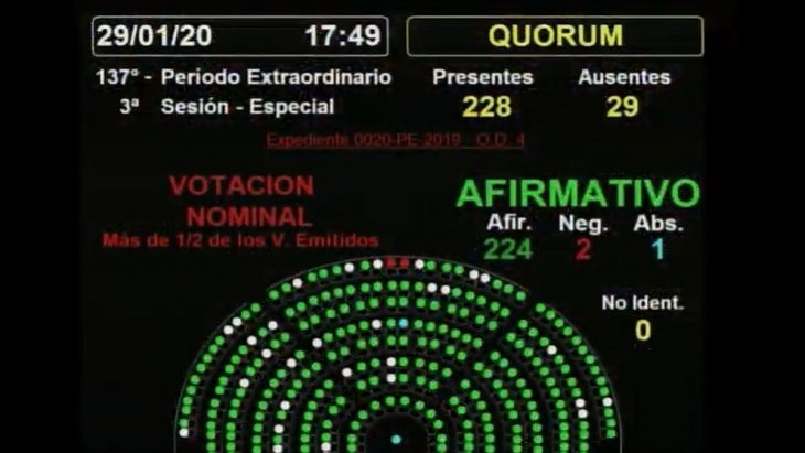 La iniciativa del Ejecutivo fue aprobada por 224 fotos a favor, 2 en contra y una abstención. La votación contó con el apoyo de la oposición. Se coincidió en armar una Comisión Bicameral de Seguimiento de la Deuda.