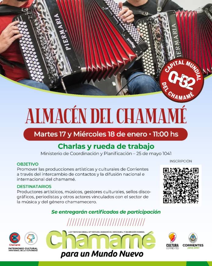 Con el objetivo de promover las producciones artísticas y culturales de Corrientes y de ese modo propiciar la proyección nacional e internacional del chamamé, el Instituto de Cultura de la Provincia convoca a los interesados en participar del “Almacén del Chamamé”, que se desarrollará los días 17 y 18 de enero, en el marco de la 32ª Fiesta Nacional del Chamamé, 18ª del MERCOSUR y 2ª Celebración Mundial.