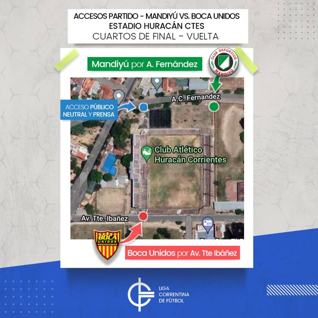 Sobre los accesos para el partido del domingo que disputarán Mandiyú y Boca Unidos en el estadio de Huracán, la Liga adelantó que: