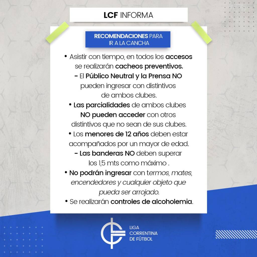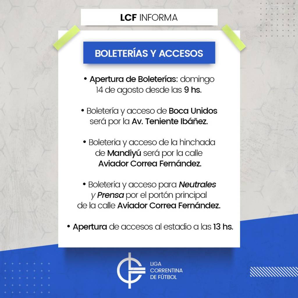 La Liga Correntina de Fútbol dió a conocer diferentes puntos inherentes al acceso y la venta de entradas para los que acudan este domingo a la revancha entre Mandiyú y Boca Unidos.