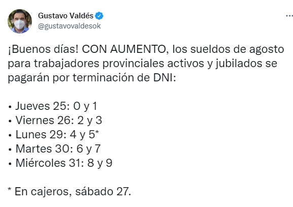 Gustavo Valdés informó, a través de su cuenta de Twitter, el cronograma de pago correspondiente a los sueldos del mes en curso, para trabajadores provinciales activos y pasivos,con los aumentos anunciados.