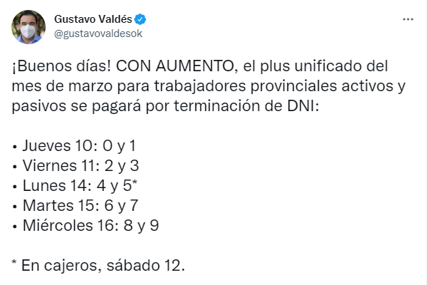 Por medio de sus redes oficiales, Gustavo Valdés informó el cronograma de pago del plus unificado del mes en curso con el aumento anunciado, para trabajadores provinciales -activos y pasivos- por terminación de DNI: este jueves 10, para los números 0 y 1; viernes 11, 2 y 3; lunes 14, 4 y 5 (en cajeros, este sábado 12); martes 15, 6 y 7; y miércoles 16, 8 y 9.