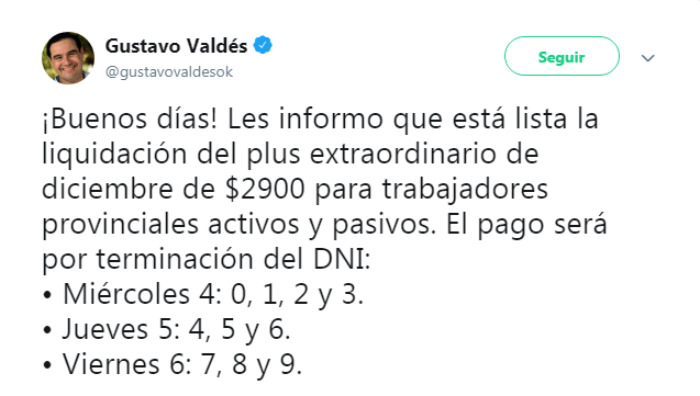 A través de su cuenta de Twitter (@gustavovaldesok) el mandatario provincial, Gustavo Valdés informó la liquidación del plus extraordinario de $2900 del corriente mes para trabajadores provinciales, activos y pasivos.