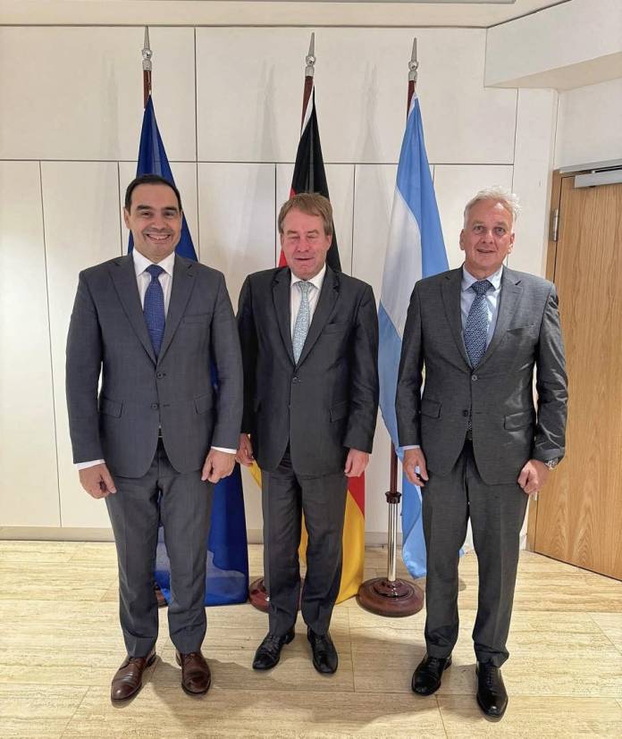 El gobernador Gustavo Valdés, con su agenda de trabajo de este miércoles puesta en la Ciudad Autónoma de Buenos Aires (CABA), se reunió con el embajador de Alemania en Argentina, Dieter Lamlé, en la sede del mencionado país europeo, encuentro del que también participó el vicepresidente ejecutivo de la Cámara de Industria y Comercio Argentino-Alemana (AHK Argentina), Gunther Neubert. El Mandatario provincial contó al respecto que “dialogamos con el fin de planificar acuerdos de colaboración entre empresas correntinas y alemanas, para promover la educación dual y facilitar la inserción laboral de los jóvenes”.